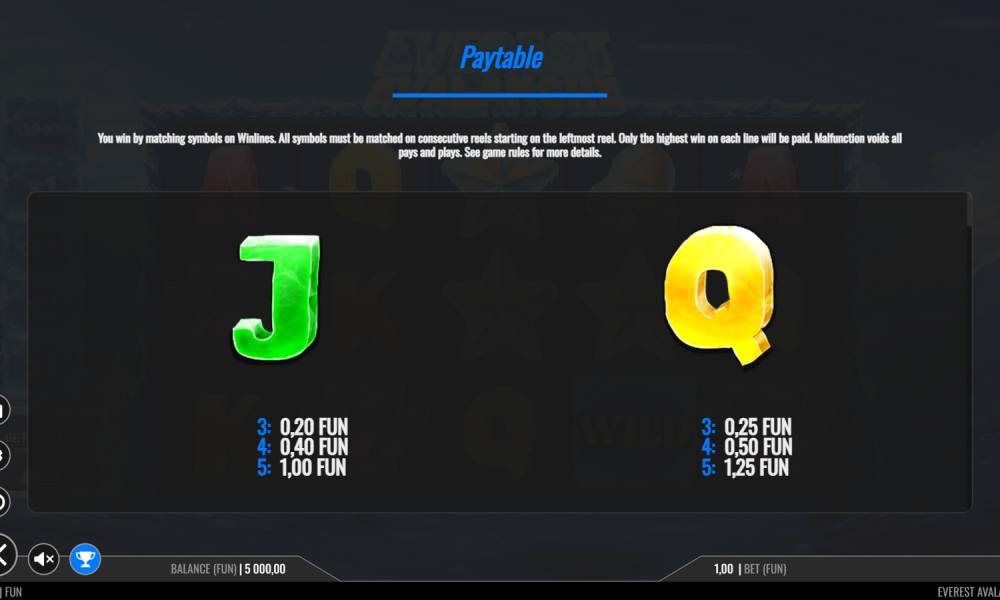 La tragamonedas de vídeo Everest Avalanche tiene 5 rodillos en 3 filas y 20 líneas de pago fijas. Para ganar, debe conseguir una coincidencia de símbolos idénticos en el orden determinado por la tabla de pagos, con la combinación ganadora comenzando en el rodillo más a la izquierda y durando consecutivamente, sin saltos. Cuantos más símbolos del mismo nombre se alineen en la línea de pago, mayor será el multiplicador aplicado a la apuesta. El multiplicador máximo de x25 promete la caída de 5 símbolos Wild.