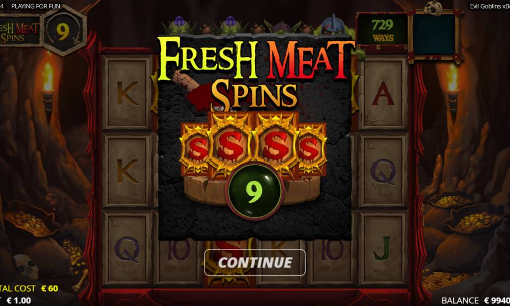 Tiradas de Festín de Goblins. Durante las 4 tiradas gratuitas, la función Evil 4 está en efecto. Todos los Goblins sobre los rodillos permanecen en sus posiciones hasta el final de la ronda y añaden multiplicadores al contador. Cualquier nuevo Goblin se transforma en un esqueleto y tampoco se va hasta el final de la partida, sustituyendo sus imágenes por el símbolo Wild. El símbolo xBOMB aparecerá en cada tirada.