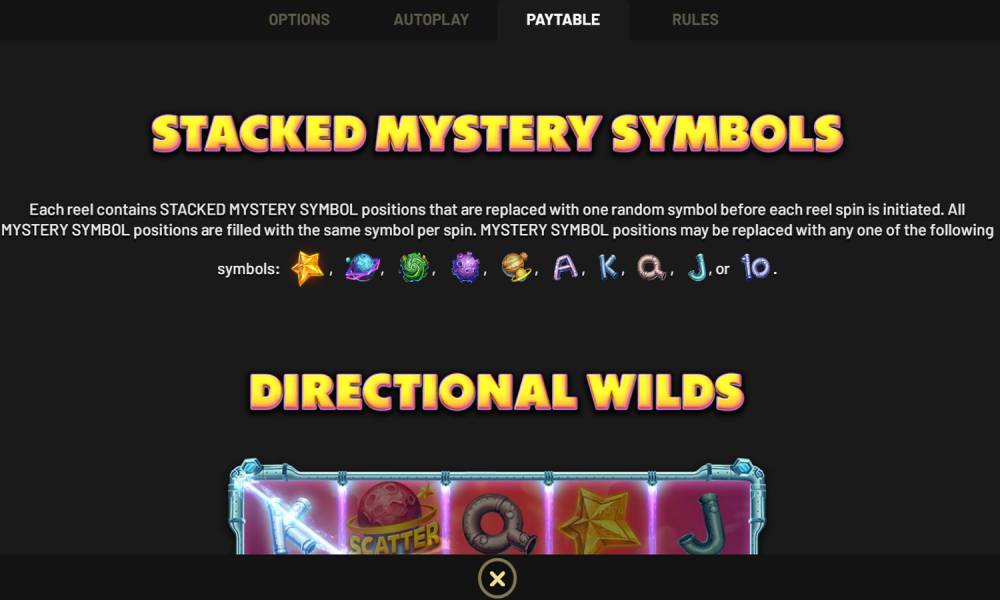 Símbolos Mystery apilados - pueden detenerse en cualquier lugar de los rodillos. En una tirada caen de 1 a 20 símbolos. Todos ellos después de parar los rodillos muestran el mismo símbolo. Sólo los símbolos Scatter y Directional Wild no pueden abrirse.