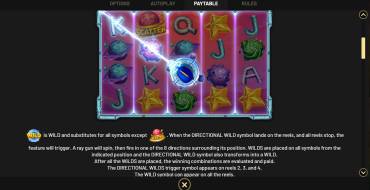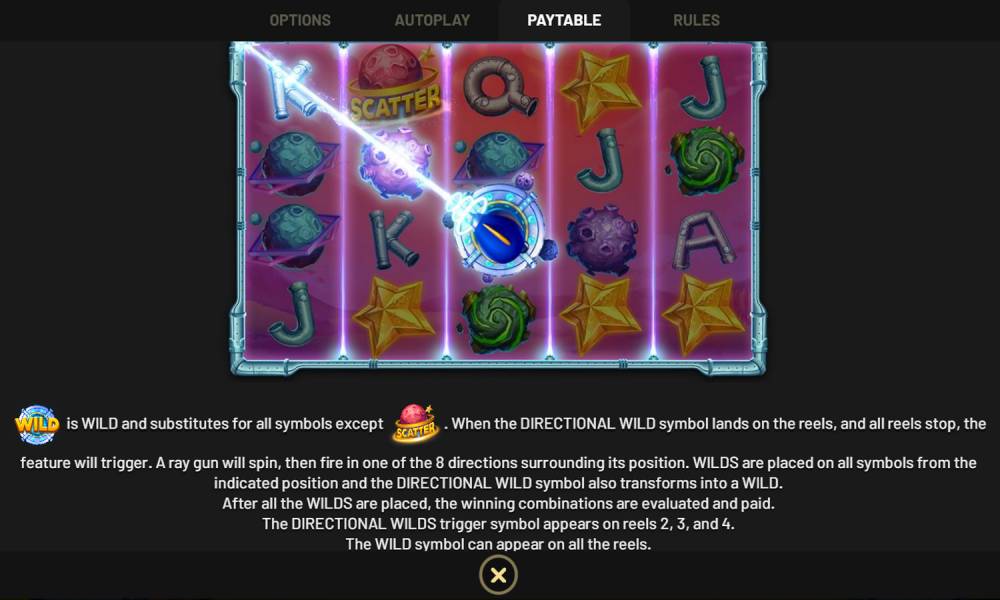 Los símbolos Directional Wild suelen caer durante las tiradas gratis. También dirigen los rayos, pero no en 1 de los 8 lados, sino en 2. Esto te permite ganar más premios por tirada. Antes de cada tirada se muestra un Multiplicador en el platillo volante cerca de los rodillos - x2, x3, x4, x5, x8 o x10. Se aplicará a todos los premios recibidos en la tirada.
