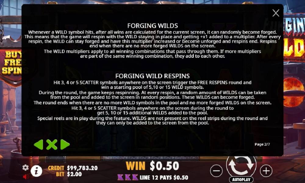 La tragaperras Forging Wilds tiene una cuadrícula estándar de cinco rodillos con tres filas y 20 líneas de pago fijas. Los símbolos incluyen cartas de la J a la A, un soplador, un yunque, un casco y un herrero.