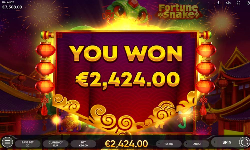 La tragamonedas de vídeo Fortune Snake tiene 6 rodillos en 5 filas, y las ganancias se cuentan en scatter. Para que se contabilice un pago, deben aparecer un mínimo de 8 símbolos idénticos en el campo de juego. La ubicación de los símbolos no juega ningún papel, el importe de las ganancias depende de su número. Los símbolos iguales jugados desaparecen, haciendo sitio a otros y provocando una caída en cascada. Los símbolos de bonificación se cuentan a partir de 4 piezas al final de una serie de cascadas, pagan mucho, activan una ronda de tiradas gratuitas de bonificación y tienden a acumularse en un tesoro sobre el campo de juego. El rango de apuestas va de 0,2 € a 70 €.