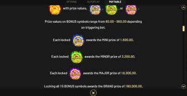 Su tamaño es el multiplicador que se aplica a la apuesta. Por lo tanto, cuanto mayores sean las cantidades que apueste un jugador, más podrá ganar en la tragaperras. Los jackpots sólo se obtienen de forma realista durante la ronda de bonificación de respins. Los premios Mini, Minor y Major se obtienen en forma de monedas en los rodillos. El Jackpot Mayor se obtiene si se llenan las 15 casillas con símbolos de Bonus. Todos los Jackpots se pagan al final de la ronda Hold&Win Feature junto con el resto de premios.