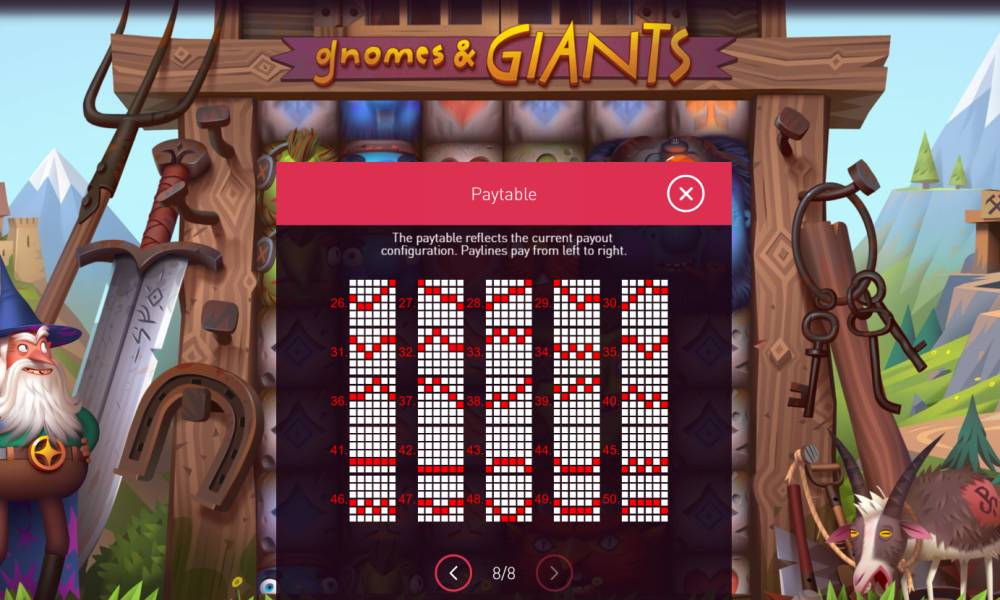 La tragaperras Gnomes & Giants tiene 6 rodillos y 50 líneas de pago. Las combinaciones ganadoras se forman con símbolos idénticos, alineados en las líneas. La apuesta mínima es de 20 monedas y la máxima de 10.000 monedas por tirada. El juego tiene un juego de riesgo, y las ganancias máximas son de hasta 8000x su apuesta. Hay que prestar especial atención a las bonificaciones y a las tiradas gratuitas, que hacen que el proceso sea aún más emocionante.