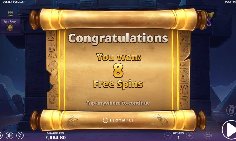 El símbolo Scatter se representa como un escarabajo con Bonus escrito en él. Al caer tres piezas se activan las tiradas gratuitas. Si entre los símbolos caídos cae al menos 1 Super Bonus, comienzan las Super Free Spins. En este caso, el jugador dispondrá de 8 intentos y todos los símbolos Wild se convertirán en Golden Expanding.