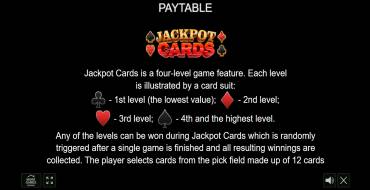 En la ronda de Jackpot Cards, que se activa de forma independiente en un momento aleatorio, los usuarios pueden llevarse un gran premio. El mayor bote corresponde al palo de picas. Tras él en tamaño vienen corazones, diamantes y tréboles. Todos los premios no tienen un importe fijo.