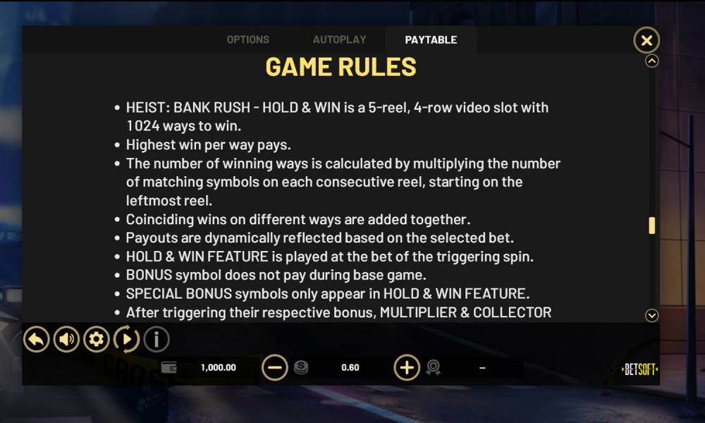En la tragaperras online Heist: Bank Rush - Hold&Win hay 5 rodillos en 4 filas. Hay 1024 líneas de pago fijas. Los símbolos base están representados por 4 mayores y 5 menores. Todos ellos dan un pago de 3 piezas por línea. También hay símbolos especiales con características y reglas de pago especiales. El rango de apuestas es bastante pequeño - 0,2-10 euros, lo que se debe a la mecánica de la tragaperras y a los frecuentes pagos. Sólo hay una ronda de bonificación, no hay tiradas gratis ni botes.