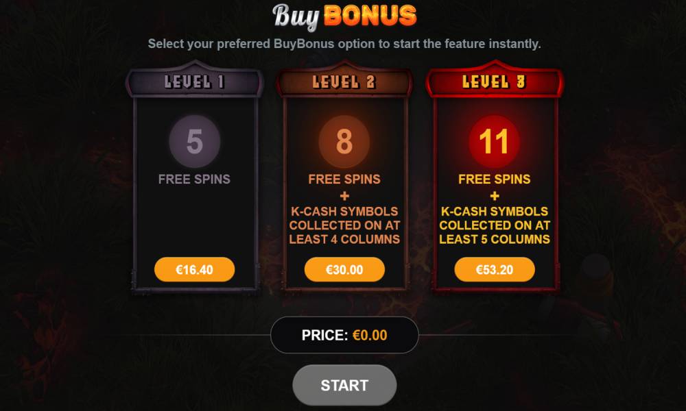 Área especial de fuego. Funciona en las tiradas gratuitas. Cuando comienza la ronda, los 3 primeros rodillos (a la izquierda) se resaltan con un marco en llamas. Todos los símbolos K-Cash que aparecen en él pagan inmediatamente. Cada símbolo de este tipo que cae fuera del marco se añade al contador situado encima del campo. Cuando el contador está lleno, el jugador obtiene +3 FS y el Área de Fuego Especial se expande 1 rodillo a la derecha.