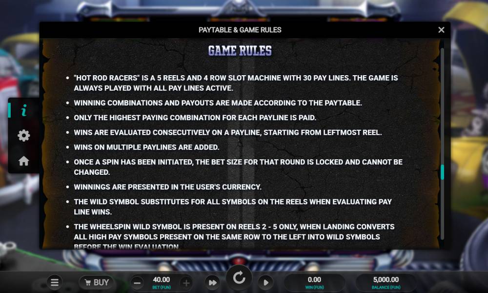 Las reglas básicas de Hot Rod Racers de Relax Gaming incluyen una disposición clásica de los símbolos en los rodillos y muchas oportunidades de formar combinaciones ganadoras. El juego utiliza una variedad de símbolos, incluyendo símbolos normales y especiales: los comodines sustituyen a otros símbolos para crear combinaciones, mientras que los scatters activan tiradas gratis. No es posible duplicar las ganancias mediante la ronda de riesgo de la tragaperras.