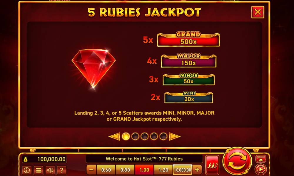 El símbolo de rubí rojo Scatter activa los jackpots y el Magic Respin. Cuando consiga de 2 a 5 símbolos Scatter, podrá ganar uno de los cuatro jackpots: Mini, Minor, Major o Grand, que pagan 20x, 50x, 150x o 500x de su apuesta.