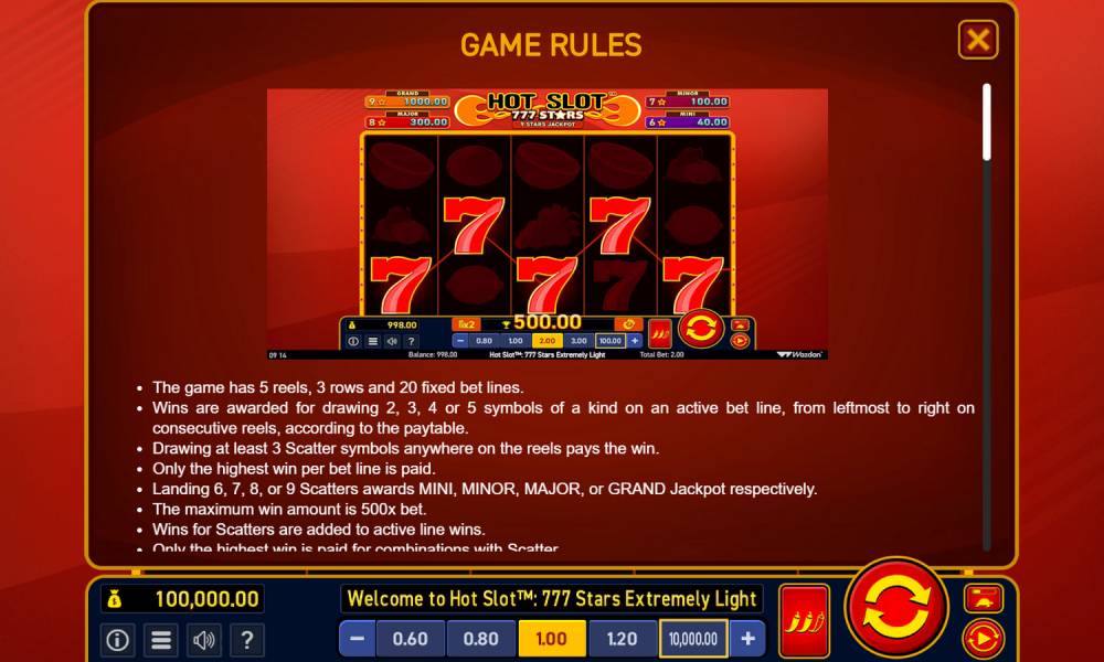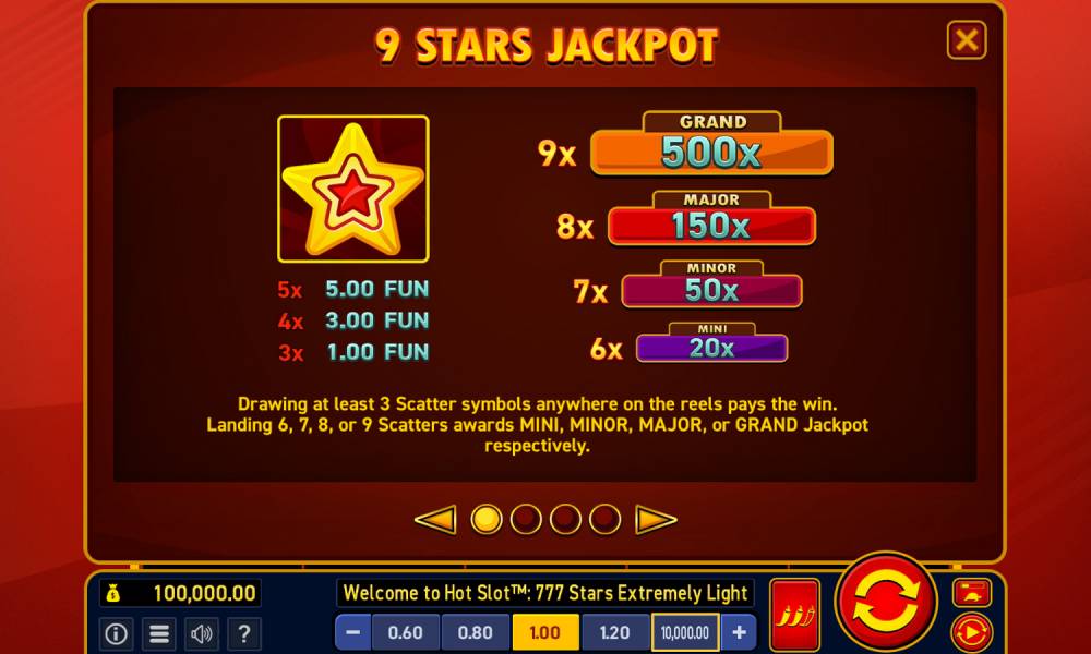 Los Jackpots te dan la oportunidad de conseguir grandes ganancias cuando se dan ciertas combinaciones. Hay cuatro tipos de jackpots disponibles en Hot Slot: 777 Stars Extremely Light de Wazdan: