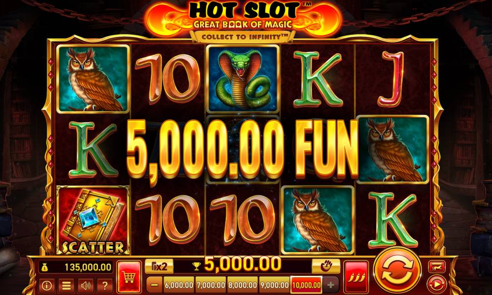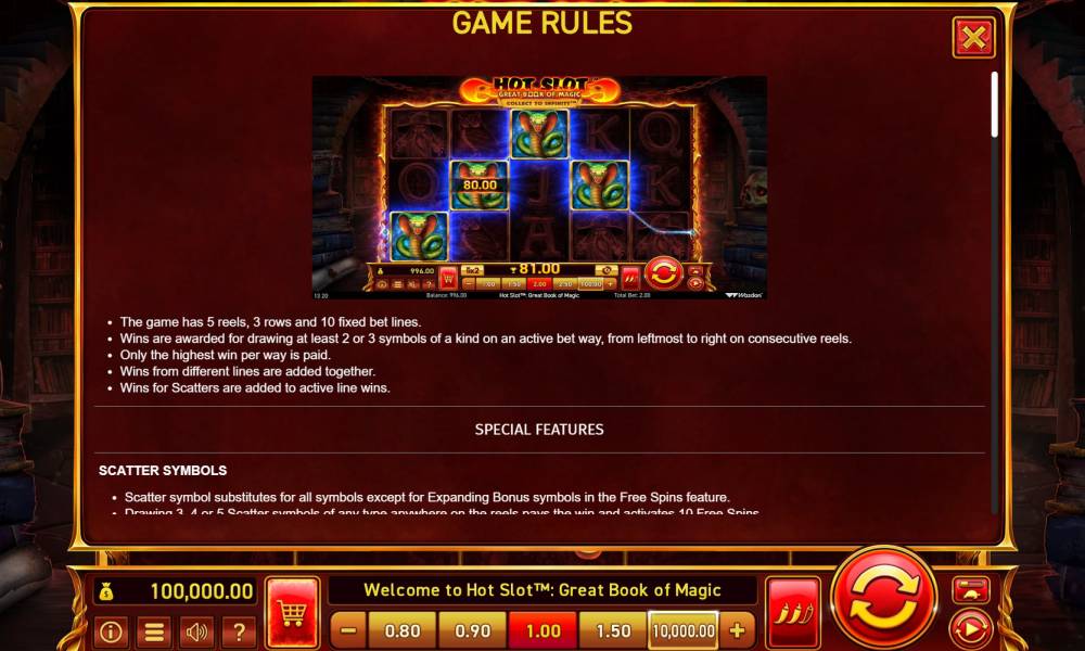 La apuesta máxima en el juego Hot Slot: Great Book of Magic es de 10000 monedas.