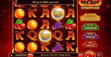 La Hot Slot: Magic Pearls utiliza una cuadrícula de 5x5 con un sistema Pay Anywhere, lo que significa que no se necesitan líneas de pago fijas para ganar. Las ganancias se forman cuando aparecen de 10 a 22 o más símbolos iguales en cualquier lugar de la pantalla. Los símbolos principales son frutas y perlas, que activan las funciones de bonificación. Necesita reunir 6 o más símbolos de bonificación para activar la ronda de bonificación Hold the Jackpot. Todos los símbolos de bonificación se vuelven fijos durante una tirada si hay 3, 4 ó 5 de ellos en la pantalla, lo que aumenta las posibilidades de activar la bonificación. La apuesta mínima en la tragaperras online Hot Slot: Magic Pearls es de sólo 0,2 monedas, y la apuesta máxima alcanza las 10000 monedas. Las ganancias máximas que puede obtener un jugador durante el juego alcanzan hasta 2500x de la tasa especificada por tirada. La ronda de bonificación principal incluye respins, que se reinician a 3 cada vez que aparece un nuevo símbolo de bonificación. Hay un juego de riesgo que te permite doblar tus ganancias.