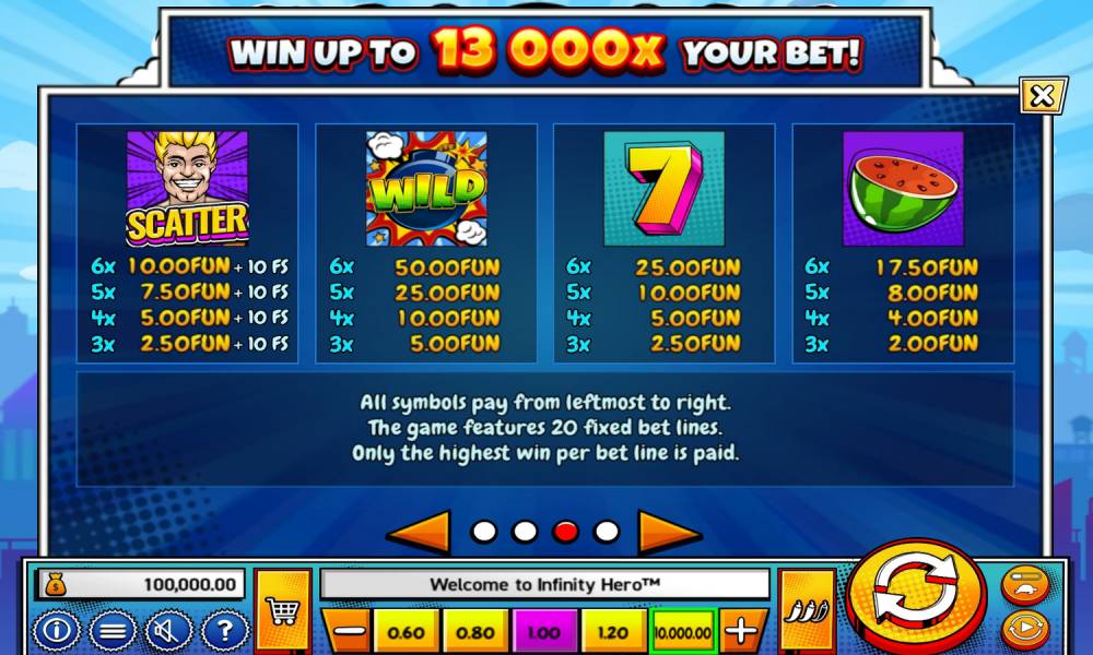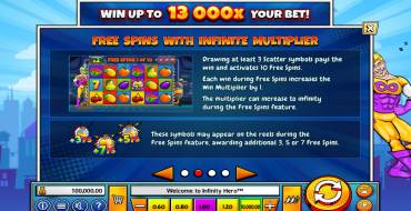 Wazdan's nfinity Hero es una tragaperras para fans de los cómics y los superhéroes que impresiona por sus coloridos efectos visuales y sus juegos de bonificación. Probé la tragaperras y me di cuenta de que en esta tragaperras online todo está orientado a sumergir al jugador en la atmósfera del mundo de los héroes: gráficos coloridos y sonido dinámico sumergen en la acción desde los primeros segundos, y la animación del héroe de fondo añade interactividad. Para conseguir las máximas ganancias en Infinity Hero, es necesario reunir una combinación de factores de éxito: tiradas gratis con multiplicador infinito, tiradas gratis adicionales y seleccionar correctamente el nivel de volatilidad. La combinación de todos estos factores puede llevar al jugador a una ganancia máxima de 13000x la cantidad apostada.