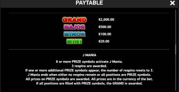 Superpremio. En tiradas simples, sólo aparecerán 5 en el rodillo 5. Si aparecen 5+ Premio + 1 Súper Premio en el campo, se activará la ronda de regiros mejorados Super J Mania. En la ronda Super J Mania, el Super Premio puede tener un multiplicador de x5 a x100, o cualquiera de los botes, incluido el Grand.