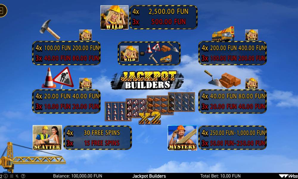 La demo de la tragaperras Jackpot Builders te da la oportunidad de sumergirte en el juego de forma gratuita y segura. Todas las apuestas serán en monedas de proveedor solamente con la posibilidad de actualizar su depósito en cualquier segundo. Haz girar los rodillos y obtén toda la información sobre la tragaperras sin ninguna dificultad. Conozca el juego sin registrarse, lo que le dará confianza cuando pase a las apuestas reales. También en Casinoz hay muchas versiones demo que te darán emociones positivas.