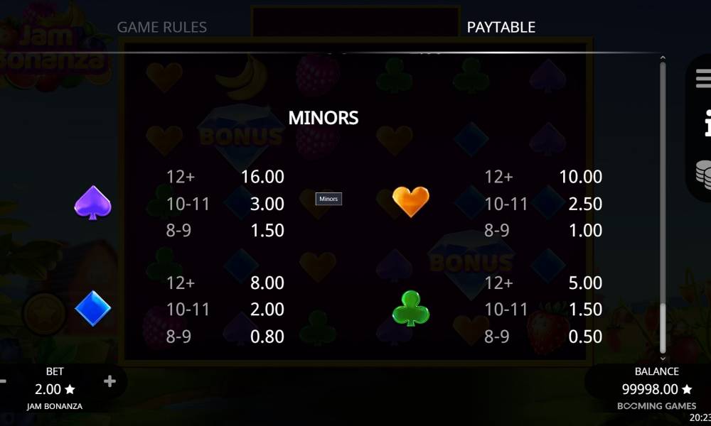 Las tiradas gratuitas de Jam Bonanza se pueden ganar o comprar. Para ganar, necesitas 4+ símbolos Scatter (etiquetados como Bonus) en el campo: estos te dan 10 Free Spins. Se puede comprar el mismo número de tiradas gratuitas en Buy Bonus a x100 de la apuesta.