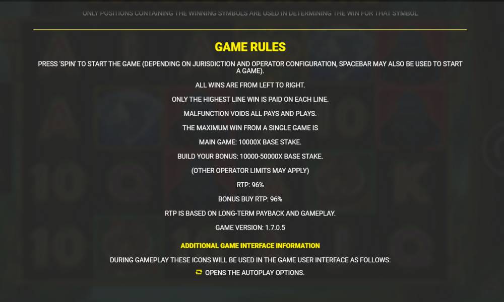 El jugador puede familiarizarse con las reglas, la tabla de pagos, los símbolos y las características en cualquier momento en el menú. Se indica mediante un botón con tres barras horizontales. La bonificación por compra también está activa entre tiradas, se puede elegir según su deseo y capacidad financiera.