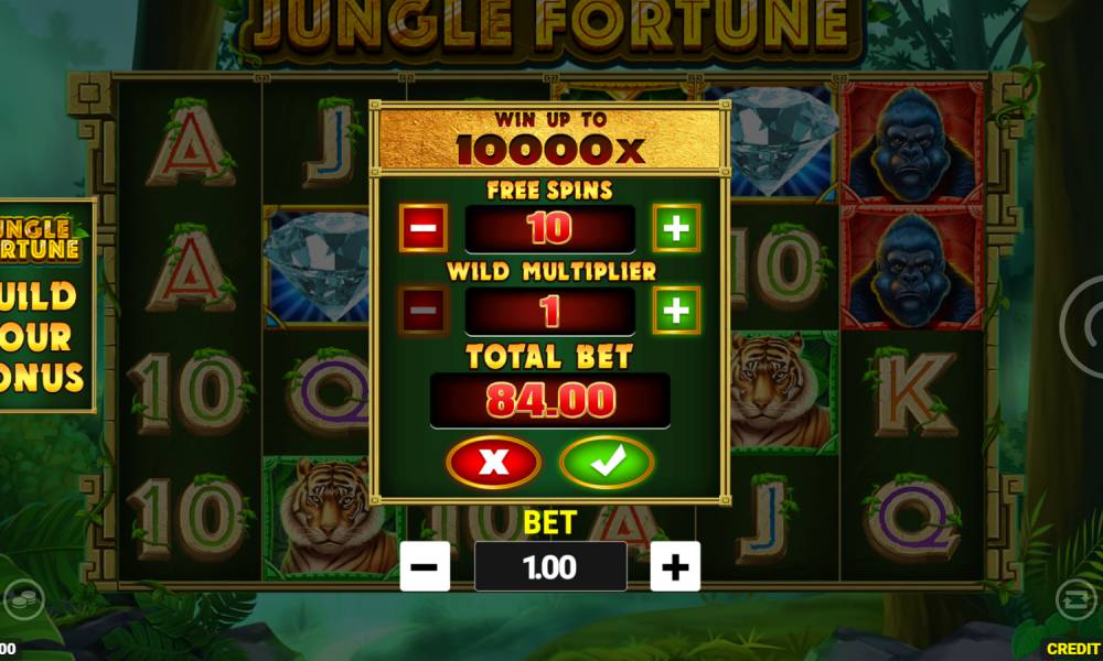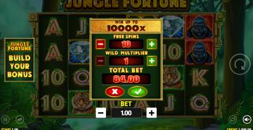 Seis rodillos de cuatro filas cada uno componen el campo de juego de la tragaperras Jungle Fortune. En él aparecen animales (4 tipos de símbolos mayores) y símbolos de cartas (6 piezas menores). Todos los símbolos dan premio a partir de tres símbolos y sólo el gorila a partir de dos. Las cadenas se hacen del borde izquierdo al derecho en 4096 líneas de pago. Los usuarios pueden ganar o comprar tiradas gratuitas, así como obtener multiplicadores. La apuesta por tirada puede hacerse de 0,1 a 10 euros. Las ganancias máximas no superarán la cantidad seleccionada en más de 10000 veces en el juego base y 50000 en el juego de bonificación.