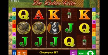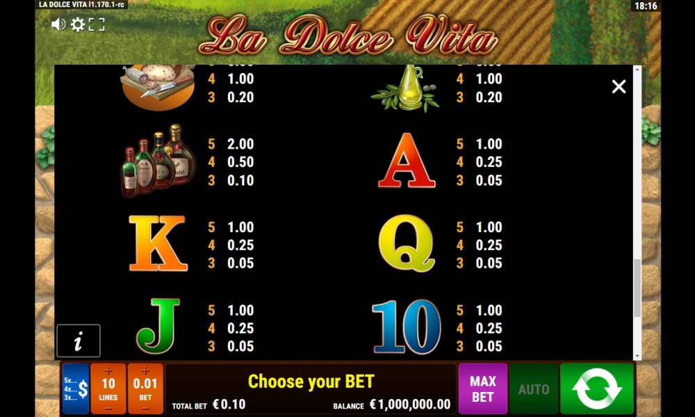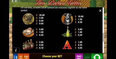 jugarás en La Dolce Vita con las vistas de la soleada Italia como telón de fondo. La estilística de la tragaperras es sencilla y agradable, los desarrolladores han prestado atención a los detalles, incluido el dibujo detallado de cada símbolo. Los símbolos son fáciles de interpretar, lo que resulta esencial para los usuarios con poca experiencia de juego. Sin embargo, los clásicos de las tragaperras también están representados aquí: los símbolos tradicionales del 10, Q, K y A. Además, el jugador tendrá que lidiar con una casa, botellas de vino, aceite y pan y salchichas. Además, hay un perro que, según la historia, debe vigilar la bodega. También está el dueño de todas estas bondades: el bodeguero.