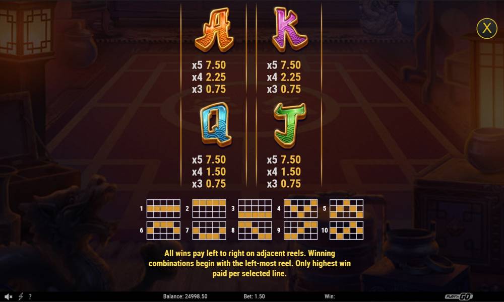 El campo de juego es estándar, de 5x3. La tragaperras utiliza 10 líneas fijas en las que se realizan las combinaciones. Legacy of Dynasties tiene 10 símbolos normales y 2 especiales. Para ganar una de las direcciones se requiere un mínimo de 3 símbolos idénticos en fila, de izquierda a derecha. La volatilidad de la tragaperras es media, lo que promete buenos porcentajes a la hora de ganar. El rango de apuestas va de 0,1 a 100 u.u., con una ganancia máxima permitida de x2300. La bonificación Expanding Symbols se aplica en el modo de juego normal, con el rodillo adicional en la parte superior para determinarlo.