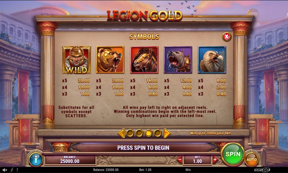 La tragaperras Legion Gold es muy fácil de manejar. El jugador debe memorizar la ubicación de sólo unos pocos botones en la parte inferior de la pantalla. "i" abre el menú de ayuda, "-" c "+" permiten cambiar el tamaño de la apuesta, y "Spin" y "Auto" son los responsables de iniciar las tiradas. Todas las opciones adicionales se eliminan de la pantalla en el menú del sistema situado en la esquina inferior izquierda.