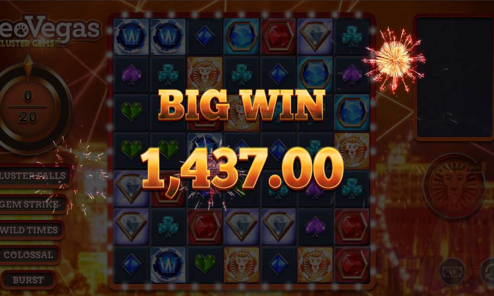 Leo Vegas Cluster Gems es una tragaperras exclusiva de Blueprint Gaming con mecánica Cluster Pays en una cuadrícula de 7x7. El juego ofrece ganancias en cascada, modificadores de bonificación y una función de tiradas gratuitas con un multiplicador progresivo. El tema de la tragaperras online Leo Vegas Cluster Gems se basa en lujosas gemas, que se acentúan con brillantes y ricos efectos visuales. Los gráficos del juego están realizados en un estilo moderno con dibujos detallados de los símbolos, y las animaciones añaden dinamismo y viveza a lo que ocurre en la pantalla.