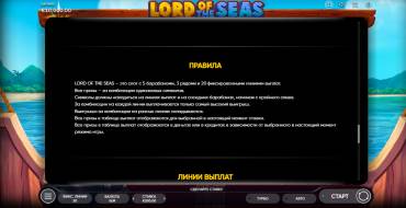 Al igual que otras vídeo tragaperras de la marca Endorphina, Lord Of The Seas está organizada de forma sencilla y clara. En el centro de la pantalla sobre el fondo del mar giran los rodillos, el panel de control se encuentra debajo de ellos, todos los botones tienen inscripciones. Los jugadores tienen unas pocas acciones que realizar: