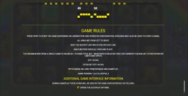 En el menú, el usuario encontrará consejos de control, reglas del juego, descripciones de las funciones y una tabla de pagos. El saldo del jugador se muestra en la pantalla principal, en la parte inferior de la página.