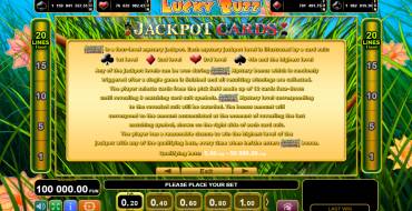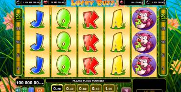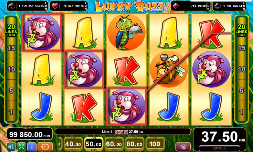 Los cinco rodillos presentan insectos de dibujos animados y símbolos de cartas. Los símbolos del primer grupo (5 fichas) son los caros, mientras que los del segundo grupo (4 clases) son los baratos. La tragaperras Lucky Buzz tiene 20 líneas de pago fijas. Las combinaciones en ellas se hacen de izquierda a derecha a partir de tres símbolos. Y sólo el símbolo más caro - una hormiga de color rosa - se paga a partir de dos piezas. En la tirada puedes apostar de 20 a 10000 monedas, cuya denominación debes averiguar en el casino. El juego supone una ganancia máxima x1000 de la apuesta.
