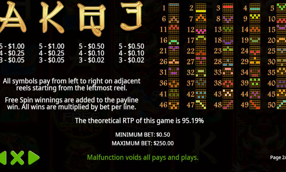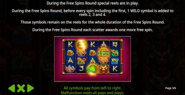 El juego se desarrolla en un campo de 5x4 con 12 símbolos. De ellos, hay 10 simples (6 mayores y 4 menores) y 2 símbolos especiales. El símbolo más antiguo, el Dragón, paga a partir de 2 en una combinación. Los demás símbolos pagan a partir de 3 símbolos en una combinación. Las combinaciones ganadoras se forman en 50 líneas fijas. No es posible cambiar el número de líneas. Hay una ronda de tiradas gratuitas, en la que funciona el inusual comodín.