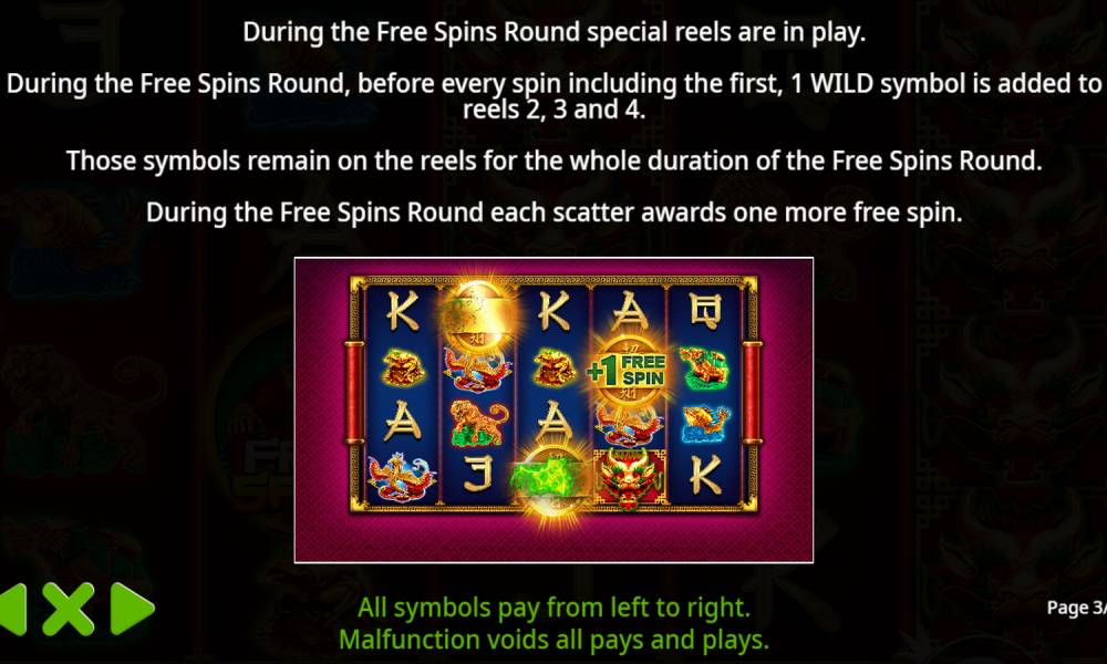 Característica Wild de tiradas gratuitas. Durante la ronda de tiradas gratuitas, se garantiza que al menos 1 símbolo Wild caerá en cada tirada en una casilla aleatoria de los rodillos 2, 3 ó 4.