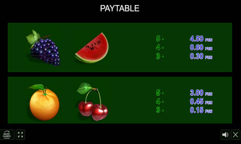 | La tema | Frutas/Verduras, Ranuras clásicas, Oro, Suerte, Acción, Comida, Joyas, Lujo, Dinero |