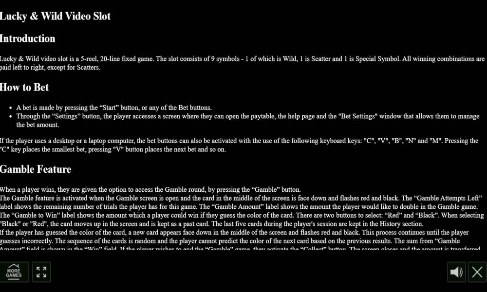 La tragaperras de cinco tambores Lucky & Wild tiene 20 líneas de pago fijas. Se premian con 3 a 5 símbolos senior (2 tipos) y junior (4 tipos). Las cadenas se hacen de izquierda a derecha desde el primer rodillo. También hay símbolos especiales, dotados de características especiales. También hay una ronda Gamble y jackpots progresivos en la máquina. El premio máximo está limitado a x1000 de la apuesta, que puede seleccionarse entre 0,01 y 1000 euros.