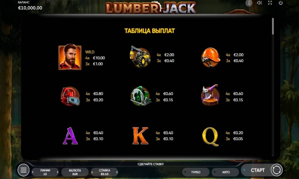 En la máquina tragaperras Lumber Jack hay 5 rodillos, dispuestos en 3 filas. El número de líneas de pago - 10, su número es fijado por el jugador. El rango de apuestas es de 0,01-100 monedas, la apuesta máxima por tirada alcanza las 1.000 monedas. La ganancia máxima por línea - x200 a la apuesta. Para la formación de líneas ganadoras se requiere la aparición de 3 o más símbolos iguales en los rodillos vecinos. Se tienen en cuenta las combinaciones que empiezan por el rodillo situado más a la izquierda y van hacia la derecha. El rodillo 5 está ocupado por multiplicadores x2, x3 y x5, que están bloqueados y se abren uno a uno durante el juego. Si una combinación ganadora y un multiplicador desbloqueado coinciden en la misma línea activa, el pago se multiplica por el número de veces correspondiente. Cada símbolo también proporciona un multiplicador a la apuesta. El mayor (x100) lo proporciona el Comodín que cae de 4. El importe del pago depende del tamaño de la apuesta y del número de símbolos que caen.