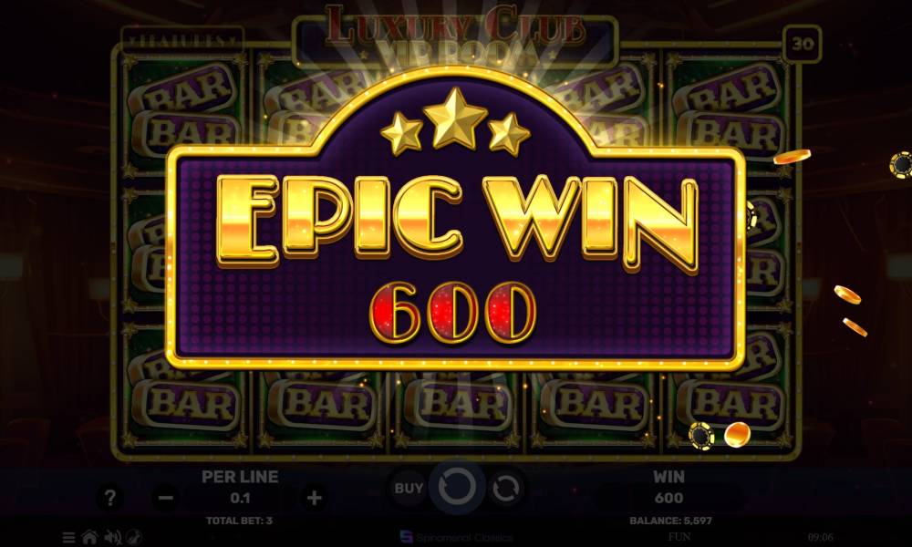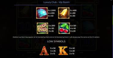 El campo de rodillos en Luxury Club - Vip Room es bastante estándar, 5x3. Tiene 30 líneas de pago activas para crear combinaciones. Tres símbolos idénticos empezando por el rodillo situado más a la izquierda se consideran ganadores. El kush máximo alcanza x1000 de la apuesta establecida, que puede elegirse entre un rango de 0,3 a 300 euros. El juego se caracteriza por una volatilidad media, lo que reduce ligeramente los riesgos del usuario. Las tiradas gratuitas pueden lanzarse de la forma habitual o a través de la función Comprar. Antes de que comiencen, la bonificación permite al usuario elegir el número y el tamaño de los signos apilados. El juego incluye nueve símbolos estándar y dos símbolos especiales.