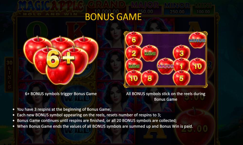 Cuando consigas más de 6 manzanas de bonificación, se activará la ronda Hold and Win. Se trata de un juego de tres reinicios. Cada nueva manzana reinicia el contador a tres. Todos los símbolos de bonificación, una vez parados, se congelan en su lugar hasta el final de la ronda. Durante el juego, no sólo puedes conseguir las recompensas en metálico habituales, sino también ganar botes. Para ello, necesitas manzanas con los nombres correspondientes para detenerte.