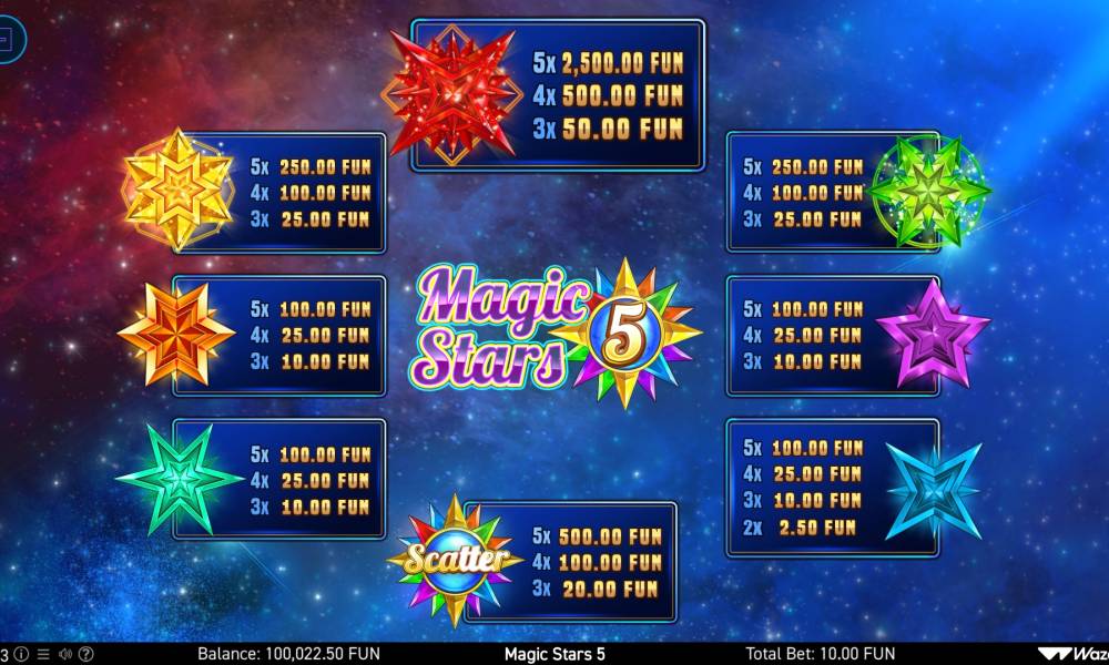 Magic Stars 5 es una tragamonedas de vídeo de Wazdan que ofrece estrellas brillantes que esconden premios inimaginables. Esta tragaperras ofrece una gran calidad de juego y emociones emocionantes, especialmente con la posibilidad de ganar gracias al símbolo Scatter que paga en cualquier posición de los rodillos. He probado la tragaperras Magic Stars 5 de Wazdan y ¡es una experiencia realmente emocionante! Magic Stars 5 impresiona no sólo por sus coloridos gráficos, sino también por la posibilidad de ganar hasta 305 veces tu apuesta. Y hay modos para todos los gustos: ¿quieres un juego tranquilo o uno de auténtica acción? ¡Sólo tiene que elegir la volatilidad adecuada! En esta tragaperras de Wazdan no te aburrirás. ¡Pruebe y sienta usted mismo la emoción!