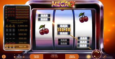 El campo de juego tiene una cuadrícula de 3x3. Los pagos se realizan por 3 símbolos idénticos colocados en cualquiera de las 5 líneas fijas. Las cerezas dan x2 de la apuesta, 1 BAR - x3, 2 BAR - x5, 3 BAR - x10, campanas - x20, siete - de x200 a x1200 dependiendo de la posición que ocupe. Además, tres de cualquier símbolo BAR traen x1. No hay tiradas gratis ni juego de riesgo. Apuesta en el giro puede ser cantidades de 0,5 a 500 euros. Esta amplia gama le permite jugar a los principiantes que aún no están dispuestos a gastar mucho, y los grandes apostadores que quieren reponer rápidamente el bankroll. La ganancia máxima en la ranura es x6000 de la apuesta.