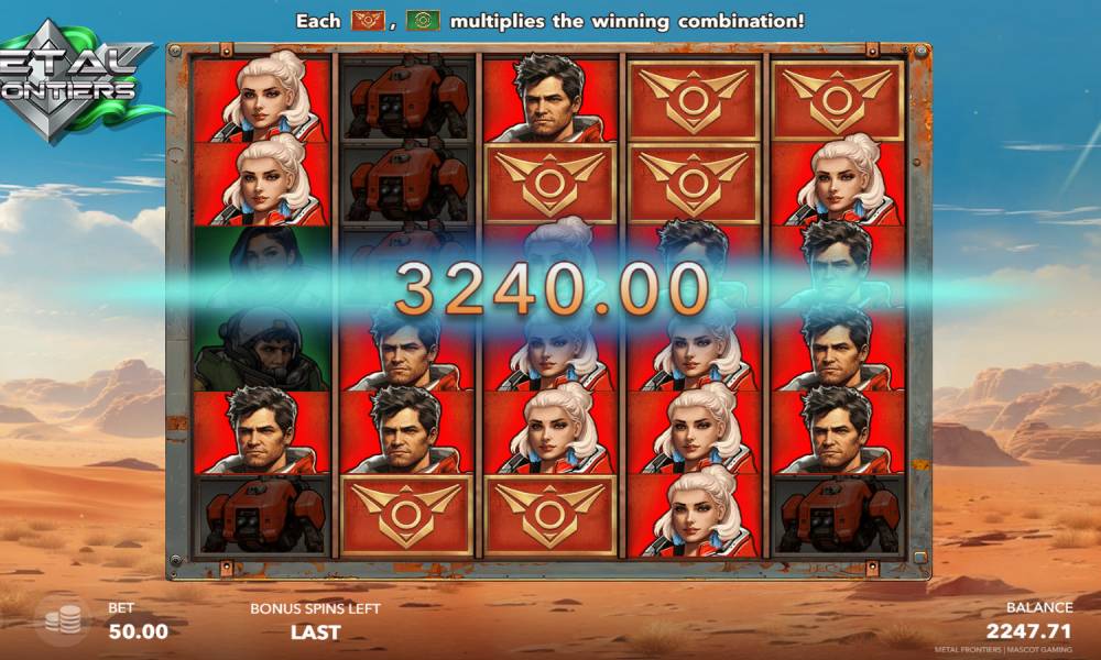 La tragaperras Metal Frontiers salió a la venta a mediados de noviembre de 2024. Los desarrolladores son el estudio Mascot Gaming. La tragaperras está dedicada al tema de las guerras del futuro. Me gustó la jugabilidad desde las primeras tiradas. Metal Frontiers tiene un gran campo, los pagos se forman según el principio de "los símbolos pagan en todas partes" para 7+ signos idénticos en el campo. Cada ganancia desencadena una cascada con sustitución gratuita de los símbolos ganadores por otros nuevos. Se pueden aplicar multiplicadores adicionales a las ganancias. Hay un juego de bonificación y una ronda de riesgo.