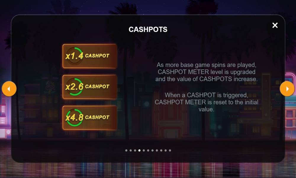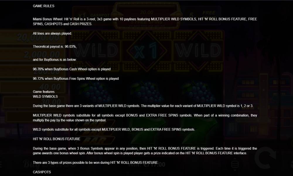 Las tiradas gratuitas en Miami Bonus Wheel Hit'n'Roll sólo se pueden ganar en la rueda de la fortuna. El número depende del valor del Medidor de Tiradas Gratis, y puede ser desde 5 (valor base) hasta 12 (máximo que se puede acumular). Hay 3 tipos de FS, entre los que se diferencian por el tamaño del multiplicador adicional en Wild: x1, x2 o x3. En las tiradas gratis, puedes conseguir tiradas extra por cada signo de Extra Spin en cualquier casilla.