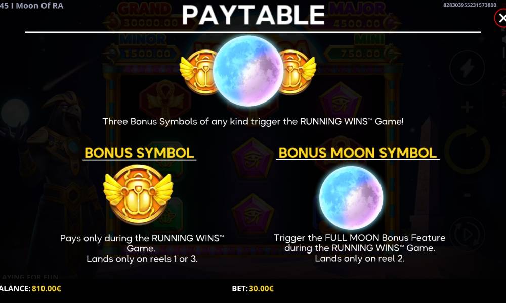 Los efectos visuales del juego están llenos de icónicos símbolos egipcios, que te dan acceso a una variedad de funciones de bonificación, como re-giros y grandes ganancias. Moon of Ra: Running Wins te transportará a una época en la que los dioses se comunicaban con los humanos y los destinos los decidían las estrellas.