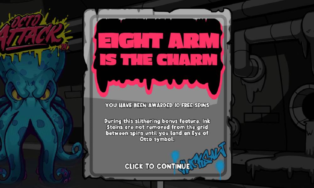 Eighth Arm Is The Charm: por cada acierto de tres símbolos Scatter, el jugador obtiene tiradas gratis, y las Ink Stains se guardan hasta el final de la ronda.