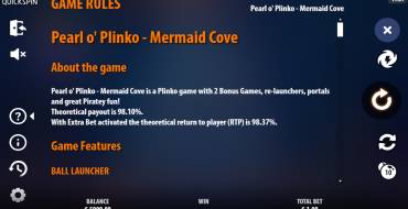 Quickspin ofrece la original tragaperras Pearl o' Plinko - Mermaid Cove sobre las aventuras de unos piratas en busca de un tesoro. El juego no tiene los tradicionales rodillos, líneas de pago, símbolos Wild y Scatter. Los principales son las bolas de perlas que se derraman de la concha y traen a los jugadores maravillosas ganancias. La cuantía de los premios se ve afectada por el número de bolas, la apuesta seleccionada, los obstáculos con diferente funcionalidad y la suerte. Dos juegos de bonificación, que pueden adquirirse si se desea, ayudan a aumentar los pagos.
