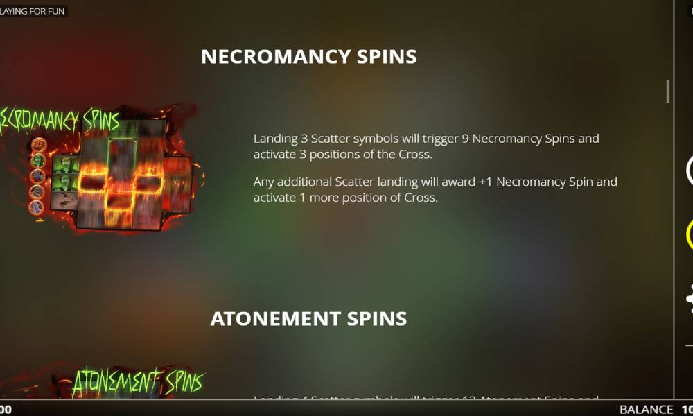 Giros de Expiación. Esta es la ronda de giros gratis que se activa con 4 símbolos Scatter. Conceden 12 giros y activan 4 casillas cruzadas. La aparición de un símbolo Scatter en el campo durante las tiradas gratuitas desencadena la activación de la ronda descrita a continuación con un giro adicional.