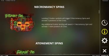 Tiradas de Nigromancia. Tres símbolos Scatter te otorgan 9 giros gratis y tres posiciones de cruz resaltadas. Golpear otro símbolo scatter especial otorgará un giro extra y pondrá los giros en el modo descrito a continuación.