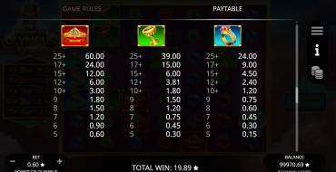 Consulta los importes de pago en Paytable (que se abre con el botón i de la parte superior derecha). La tragaperras no paga mucho: un grupo de 5 signos bajos dará x0,1 de la apuesta.