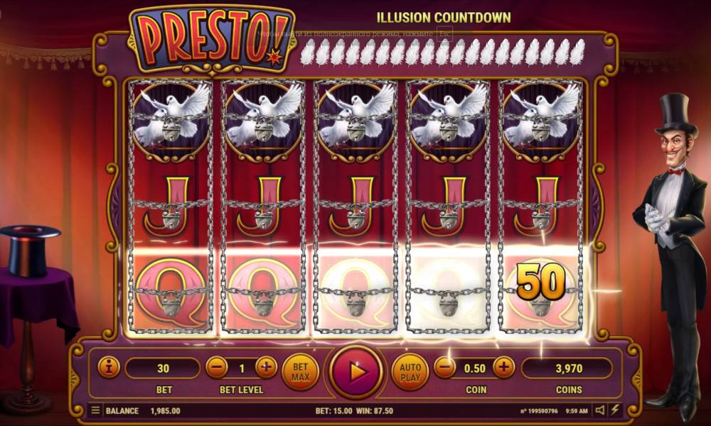 La tragaperras Presto tiene cinco tambores y tres filas de símbolos en la pantalla principal. No hay líneas activas. Las combinaciones se forman de 243 maneras.
