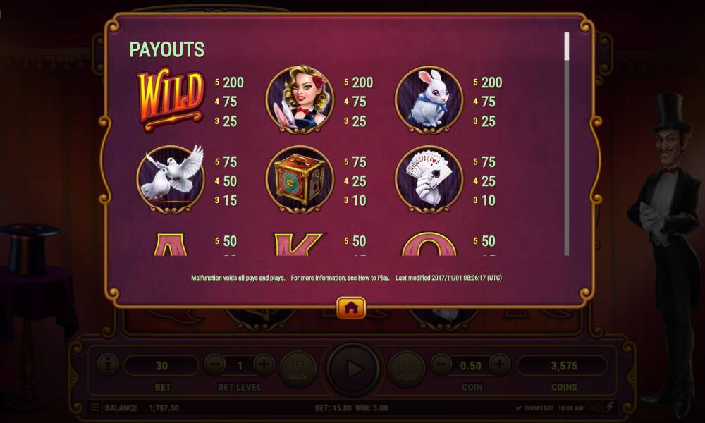 En la pantalla de la tragaperras aparecen las cartas en la mano del mago, un cofre "mágico", palomas blancas, un conejo, un ayudante y cuatro letras que representan las cartas de la sota al as.