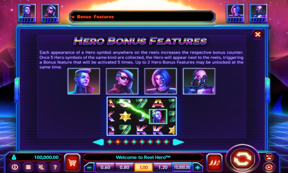 The Reel Hero de Wazdan es una tragaperras que lleva a los jugadores a un mundo futurista con héroes únicos y la misión de salvar el universo. Probé la tragaperras online y me di cuenta de que la tragaperras ofrece una serie de funciones de bonificación que hacen que el juego sea emocionante. A cada héroe le corresponde una bonificación única, que se activa en función de las condiciones del juego. Esto te permite sumergirte en el mundo de la tragaperras, sintiéndote como un auténtico superhéroe. Las ganancias máximas durante el juego pueden alcanzar 1050x del importe apostado.